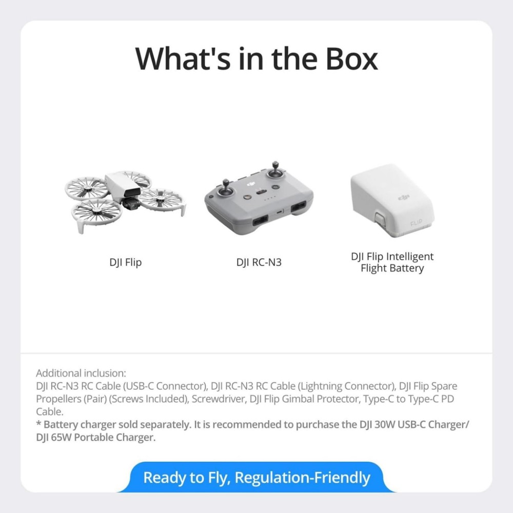 Included ComponentsDJI Flip Gimbal Protector x 1, DJI Flip Intelligent Flight Battery x 1, DJI Flip Spare Propellers (Pair) (Screws Included) x 1, DJI Flip x 1, DJI RC-N3 RC Cable (Lightning Connector) x 1, DJI RC-N3 RC Cable (USB-C Connector) x 1, DJI RC-N3 x 1, Screwdriver, Type-C to Type-C PD Cable x 1