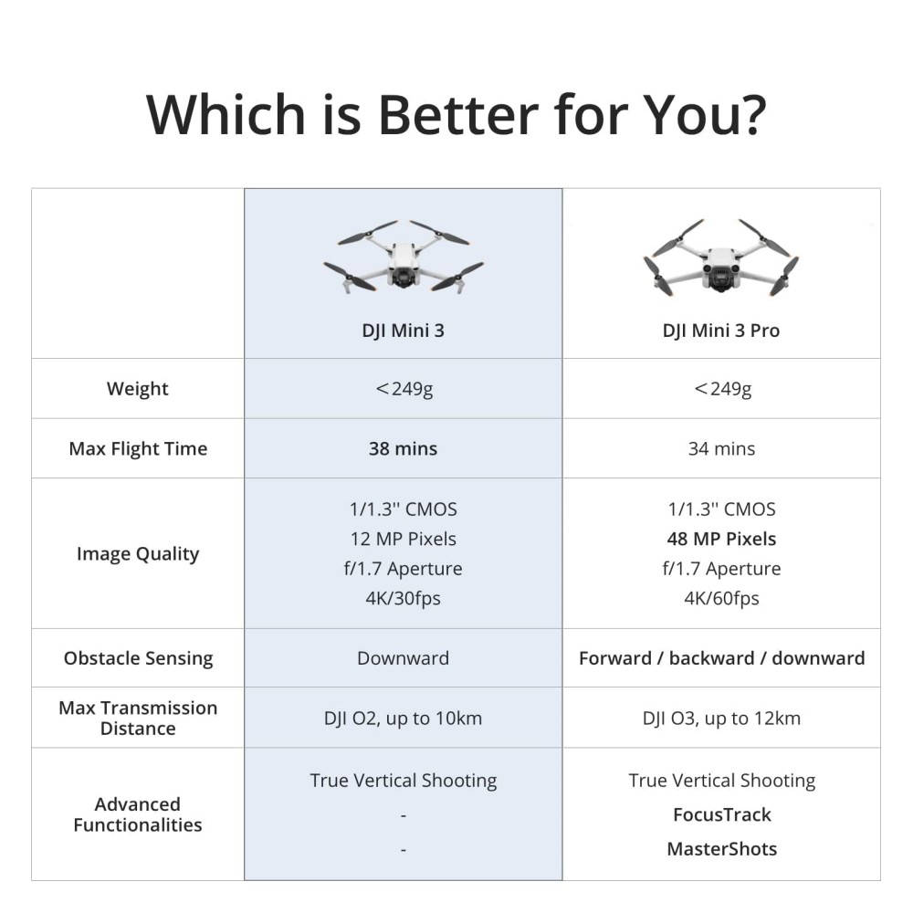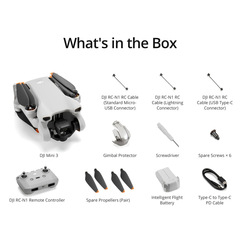 | Included Components | DJI Mini 3 x1, DJI RC-N1 RC Cable (Lightning Connector) x1, DJI RC-N1 RC Cable (Standard Micro-USB Connector) x1, DJI RC-N1 RC Cable (USB Type-C Connector) x1, DJI RC-N1 Remote Controller x1, Gimbal Protector x1, Intelligent Flight Battery x1, Propeller, Screw, Screwdriver, Type-C to Type-C PD Cable x1 |